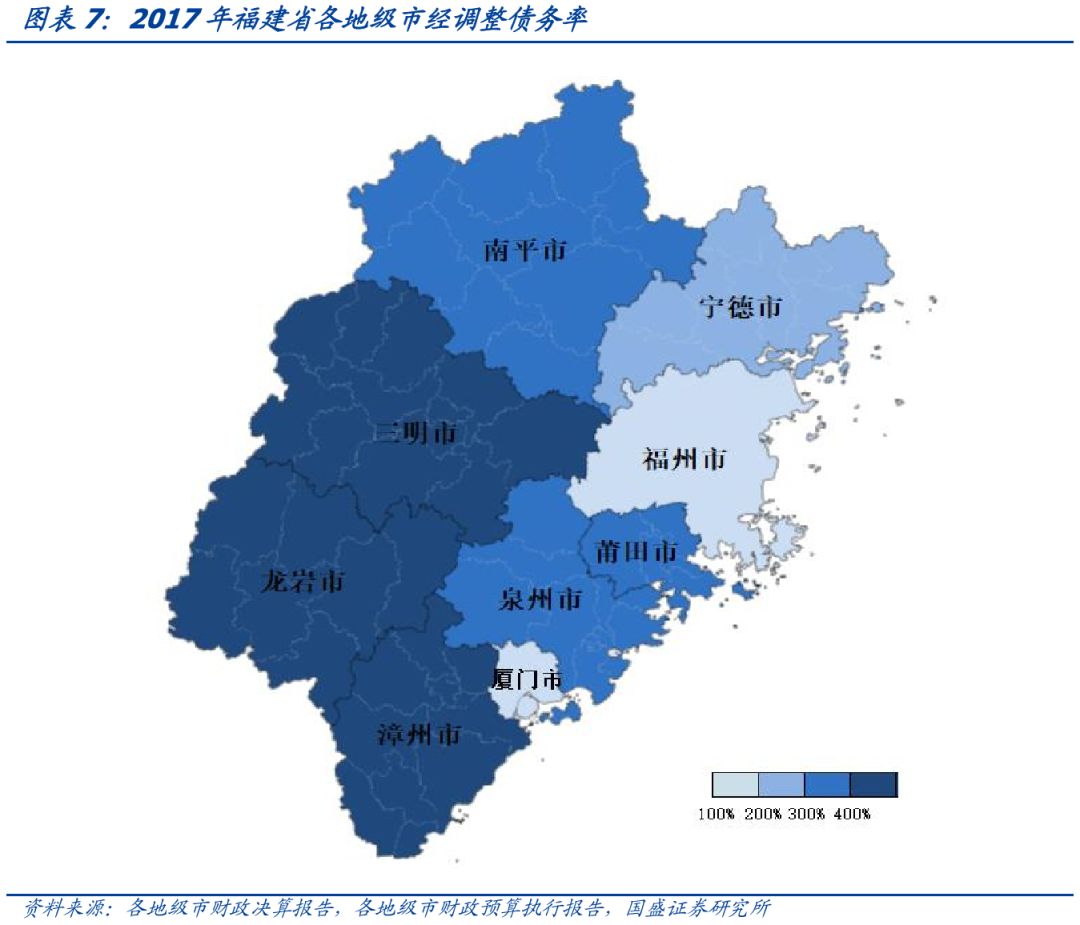 债务率方面,福建省各地级市地方政府债务余额披露较为全面,本文经调整债务率计算口径为(地方政府债务余额+地方城投债余额)/一般公共预算收入。漳州市、三明市和龙岩市较高,分别为499.8%、435.3%和408.8%。厦门市、福州市经调整债务率较低,分别为128.3%和141.1%。