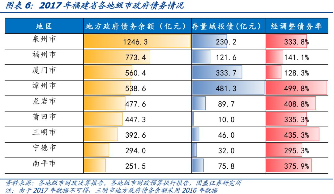 从地方政府债务余额看,2017年底,泉州市政府债务余额最大,为1246.3亿元。其次是福州市,为773.4亿元。南平市、宁德市和三明市政府债务余额相对较小,分别为251.5亿元、294亿元和392.6亿元。