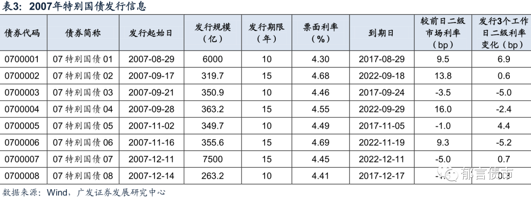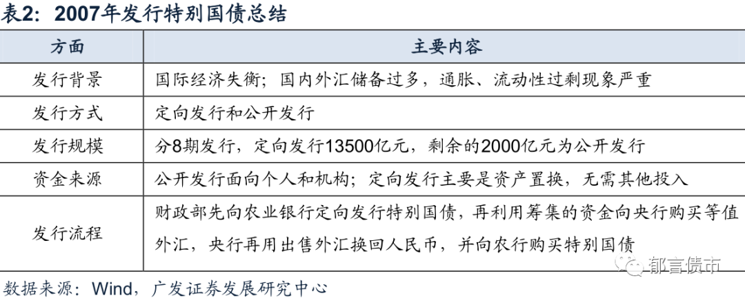 从发行方式和规模上看,2007年特别国债共分8期发行,第一期和第七期为定向发行,共计13500亿元,剩余的2000亿为公开发行。从资金来源来看,公开发行的特别国债主要面向个人和机构,定向发行的特别国债实质上是利用了资产的置换,不需要其他的资金投入,相当于减少13500亿人民币等值外汇储备的同时增加13500亿元的特别国债。