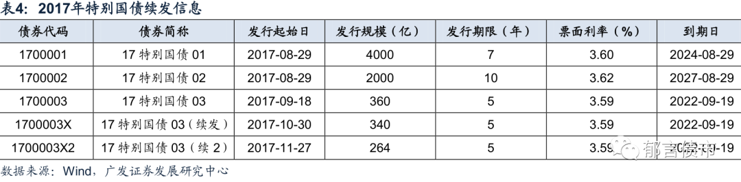 2017年:特别国债续发。2007年发行的约6963.78亿元特别国债于2017年8月、9月陆续到期,包括6000亿元定向特别国债和963.78亿公开发行的特别国债。为了保持适度稳定的流动性,在稳健中性的货币政策目标下,2017年8月29日财政部向境内商业银行定向续发6000亿元特别国债,第1期4000亿为7年期,第2期2000亿为10年期。