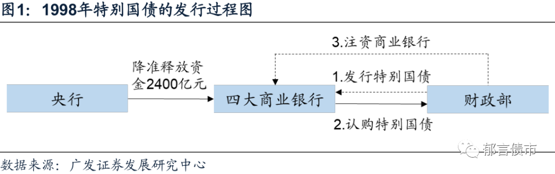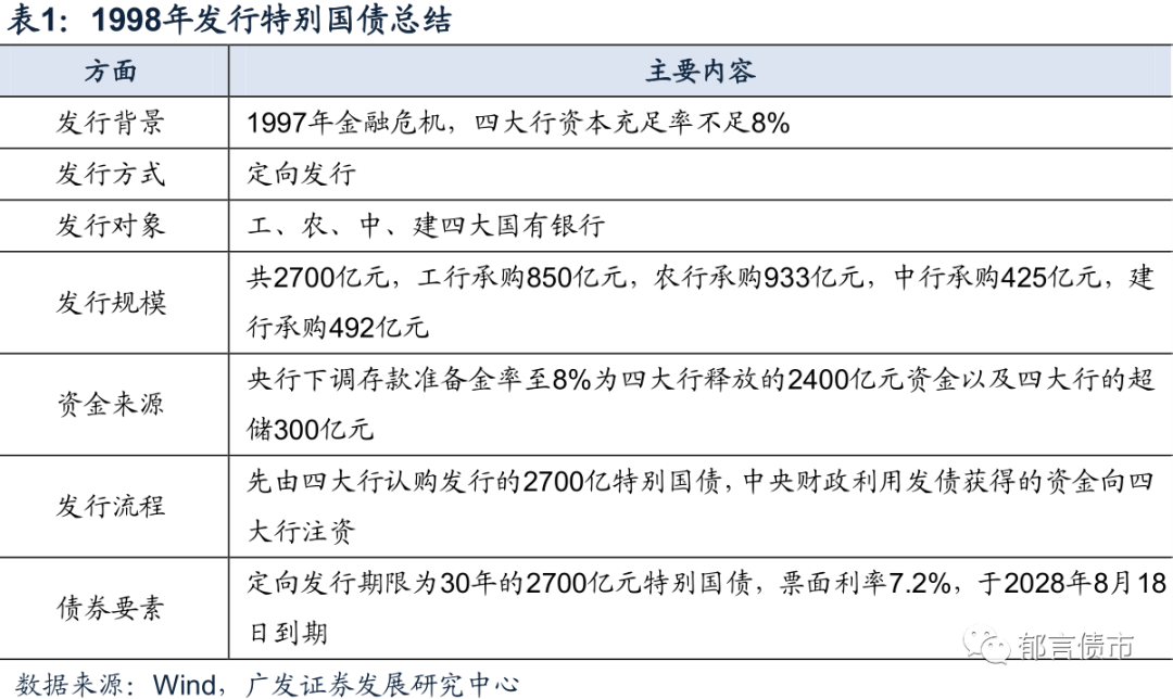 从发行对象和方式上看,本次特别国债针对工、农、中、建四大国有银行定向发行。从发行规模来看,为了使四大行满足8%的资本充足率要求,根据各个银行的实际资本充足率以及1998年底风险资产余额计算出需要2700亿元的发行额度。其中,工行承购850亿,农行承购933亿,中行承购425亿,建行承购492亿。从资金来源来看,主要来自降准释放的资金。1998年3月,央行决定将存款准备金率由原来的13%下调至8%,这一举措为四大行释放了大约2400亿的资金。同时,央行提出四大行将释放的2400亿元资金和300亿元超储,存到在中央银行的专用户头上,用于认购特别国债。从发行流程来看,首先由四大行认购发行的2700亿特别国债,中央财政再利用发债获得的资金向四大行注资,从而提高银行的资本金。