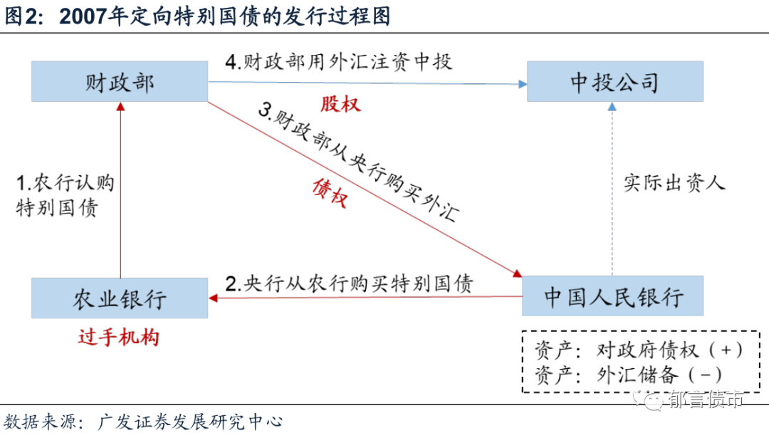 从发行过程来看,人民银行是事实上的出资人,而农行只是一个过手机构,这种操作规避了人民银行不能对财政透支的限制。首先,由农行购买财政部发行的特别国债,为了不对农行的资金头寸、资产负债及正常经营产生影响,在发行当天,人民银行就从农行全部买入此次发行的特别国债;紧接着,财政部用发行筹集的资金向人民银行购买等值外汇,从而完成对中投公司的注资,财政部成为中投公司的唯一股东,而人民银行是事实出资人。这一系列步骤最终表现为人民银行资产负债表上资产端结构的变化,即对中央政府债权增加,而外汇储备资产等额减少。