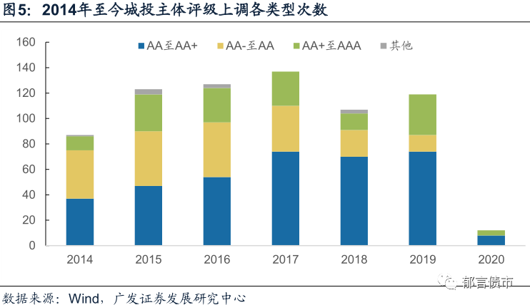 分上调类型看,2014年至今,城投主体评级从AA上调至AA+的次数最多,为364次。从AA-至AA、从AA+至AAA的上调次数分别为194次和143次。分年份看,除2014年外,上调类型最多的均是从AA上调至AA+,其中2017-2019年都在70次以上。