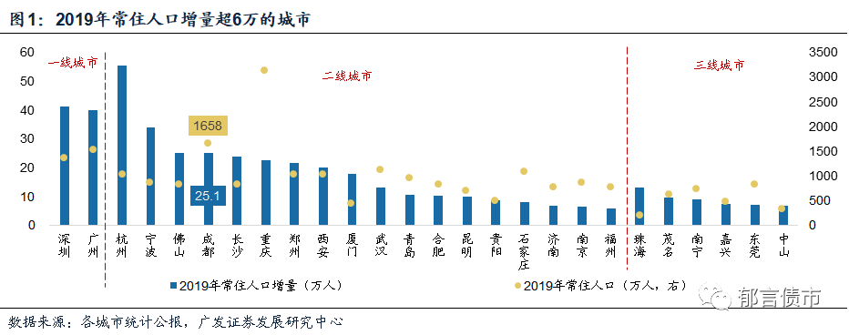 各城市横向对比来看,2019年成都常住人口增量为25.1万人,在二线城市中位列第4,人口流入为城市的经济增长带来动力。