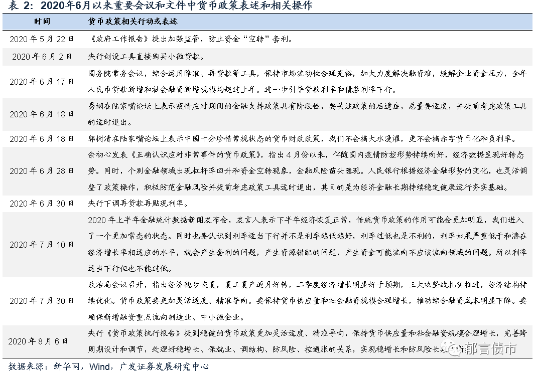 第二阶段,2020年6月到7月,央行官员表态货币政策边际收敛。进入6月,央行官员对货币政策回归常态的表述逐渐进入市场视野,6月18日人民银行行长易纲在陆家嘴论坛上提到,“疫情应对期间的金融支持政策具有阶段性,……要关注政策的‘后遗症’,总量要适度,并提前考虑政策工具的适时退出”。6月28日,资深学者余初心发表《正确认识应对非常事件的货币政策》,指出“积极防范金融风险并提前考虑政策工具适时退出,其目的是为经济金融长期持续稳定健康运行夯实基础”。7月10日上半年金融统计数据新闻发布会上,货币政策司副司长表示“要认识到利率适当下行并不是利率越低越好,利率过低也是不利的……所以利率适当下行但也不能过低”。