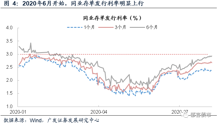 虽然本轮货币政策收紧程度不如2016年,但是本轮短端利率上行幅度已经明显高于2016年。对1年期国开债收益率进行比较,可以发现,剔除2016年底跨年资金面上行带来的“峰值”,2020年这一轮1年期国开债收益率上行幅度大于2016-2017年一轮,且上行过程也要更早。2020年4月29日利率见底,截止2020年8月7日共70个交易日,1年国开收益率在2020年这一轮上行143.7bp,而2016年10月9日利率见底,70个交易日之后,1年期国开收益率上行88.7bp。