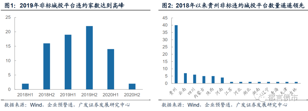 2018年下半年以来城投非标违约大幅增加,贵州遥遥领先。2018年下半年以来,由于城投非标债务开始集中到期,弱资质城投风险逐渐暴露,信托、资管计划等非标产品开始发生大规模违约。2018年下半年非标违约城投平台数量由上半年的2家,大幅增加至16家,并于2019年达到全年41家的高峰。分省份来看,2018年初-2020年8月31日贵州累计有40家城投平台发生过非标违约,遥遥领先,并且有15家是发过债券的城投。其次是云南、四川,分别有7家和6家。