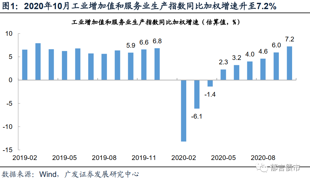 生产端来看,10月经济延续修复,工业增加值和服务业生产指数加权同比增速攀升至7.2%。10月工业增加值同比6.9%,持平前月;服务业生产指数同比7.4%,较前月上升2.0个百分点。根据两者在GDP中的比重进行加权计算,9月工业增加值和服务业生产指数加权同比升至7.2%,较8月上升1.2个百分点,已经明显超出2019年四季度的票据水平(6.4%)。自4月以来,该构造指标的上升幅度依次为4.7、3.6、1.0、0.8、0.6、1.4和1.3个百分点。从生产端数据来看,9-10月较6-8月出现加速迹象。