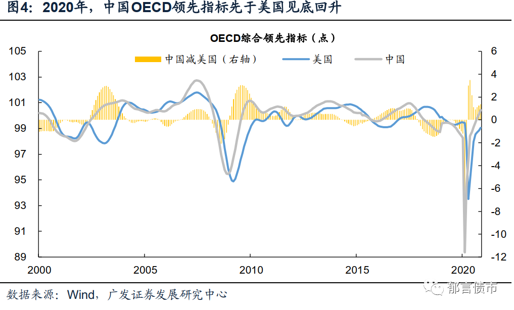 海内外经济相对节奏的变化,可能会导致2021年中美利差收窄。随着美国经济恢复,以及疫苗推进,自2020年8月开始美国长端利率趋于上行,不过上行幅度较小。从中美复苏时间差的角度来看,以OECD领先指标为例,中国经济于2020年2月见底,美国经济于2020年4月见底。而2020年二季度开始,中美经济呈现出中强美弱的格局。中国经济受疫情影响小,至四季度工业增加值同比和服务业生产指数同比基本恢复至疫情前的水平;而美国经济则受持续疫情困扰。疫苗接种可能抑制美国疫情传播,促进2021年美国经济加速修复。2020年11月14日,美国疫苗和药物攻关计划首席顾问斯拉维声称,预计美国70%民众将在2021年5月之前接种新冠疫苗。如2021年美国经济逐渐恢复,回归常态化,可能推动美国长端利率上行,从而使得中美长端利率的利差趋于缩小。