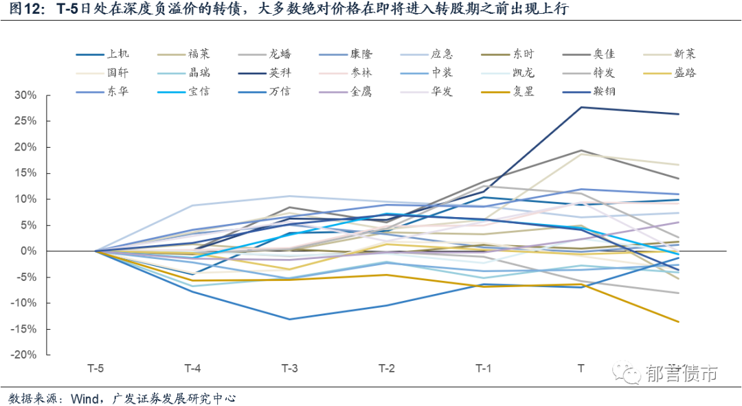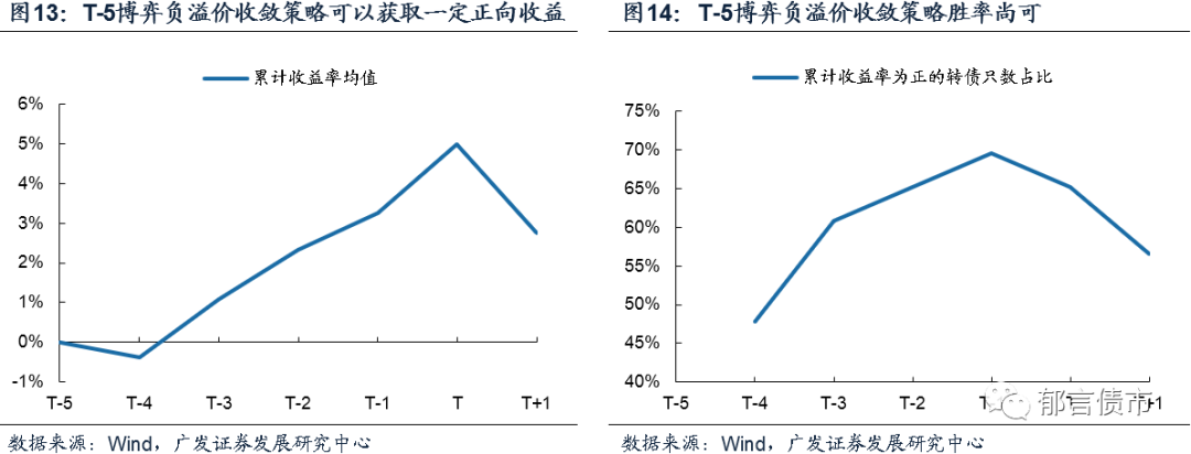 进一步观察这些样本在进入转股期前的平均累计收益水平,博弈负溢价收敛总体上可以获得持续且可观的收益。不过值得注意的是,博弈收益在T-5日前基本提前兑现完毕。我们计算了样本观测期内个券收益率累计变化均值,发现在T-30至T-6日的区间内,样本个券收益均值基本呈现向上趋势,最高累计收益率接近12%。随后在临近转股期之前的1周内,样本收益均值并未继续上涨,而是在消化此前的涨幅。也就是说,在T-30日提前布局博弈负溢价收敛,收益阶段往往会在进入转股期前1周左右完成,持有至进入转股期可能并非最佳选择。