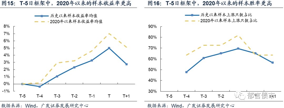 此外,我们也统计了2020年以来,在T-5日处于超过5%负溢价状态的全部转债的累计收益率,发现无论是平均收益率还是胜率均优于历史以来的样本。