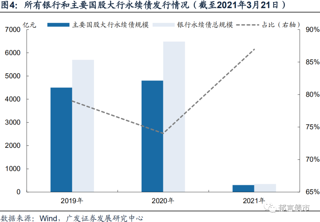 而银行永续债由于开始发行时间较晚,发行总规模较二级资本债较小,为1.2万亿,发行主体同样以资质较好的国有商业银行和股份制商业银行为主。不过随着银行永续债市场扩容速度加快,2019年到2020年,主要国股大行存续永续债占银行永续债总规模的比例有轻微下降。