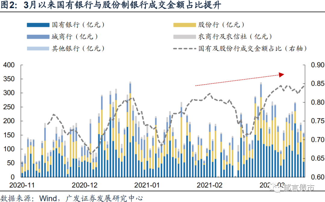 3月以来银行永续债、二级资本债成交金额明显上升。我们统计了2020年11月以来银行永续债与二级资本债成交情况,并计算了银行永续债与二级资本债成交金额占信用债及金融债全部成交金额的比重(取10日移动平均)。可以看出,11月以来银行永续债及二级资本共有两波成交高峰,一波是12月包商银行减记引发的二级资本债抛售,成交金额占比一度超过6%;一波则是当前“资产荒”下,国股大行永续债与二级资本债成为机构追逐的价值洼地,成交金额占比一度达到4.8%。不过随着银行永续债与二级资本债收益率的下行,3月中旬以来成交金额占比已有所回落。