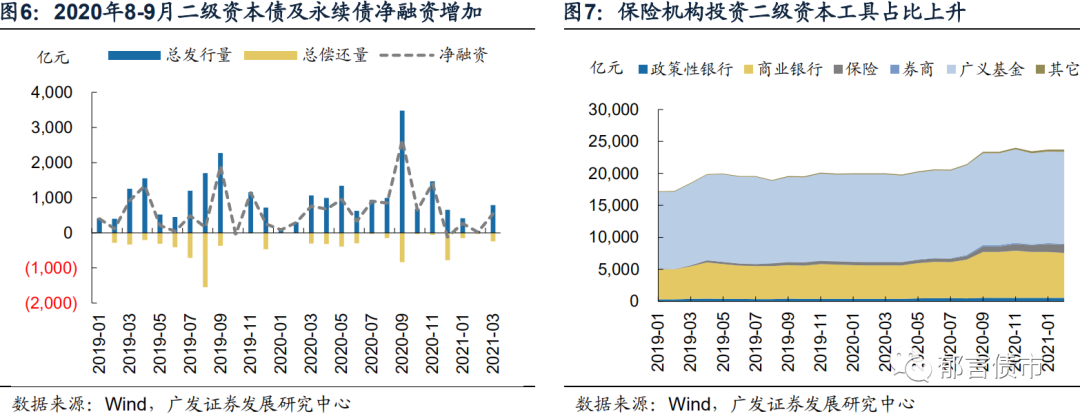 (2)2019年1月,政策宽保险机构对二级资本债的投资限制,政策利好带动利差收窄。2019年1月25日,银保监会发布通知,允许符合条件的保险资金投资二级资本债;2020年5月27日,银保监会放宽保险资金投资的资本补充债券发行人条件,取消可投资的二级资本债及永续债外部债项评级要求,险资购买二级资本债约束进一步放宽。存量视角看,截至2021年2月底,二级资本工具中保险机构持仓占比已经达到5.5%;增量视角看,2019年1月至2021年2月二级资本工具托管量累计增加约6500亿,增量的20%为保险机构持有。利好政策出台增强了商业银行二级资本工具的流动性,2019年1月及2020年6月二级资本债利差均收窄20bp左右。