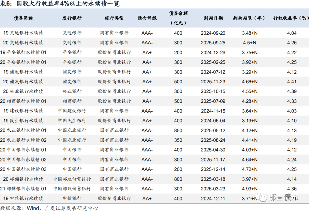整体来看,“优质资产荒”下国股大行永续债与二级资本债安全性较好,利差预计将维持低位,甚至进一步压缩,因而仍然可以参与。我们对12家国有银行与主要股份制银行的银行永续债和二级资本债进行了整理,并筛选出了行权收益率在4%以上、隐含评级AAA-的个券以供参考。