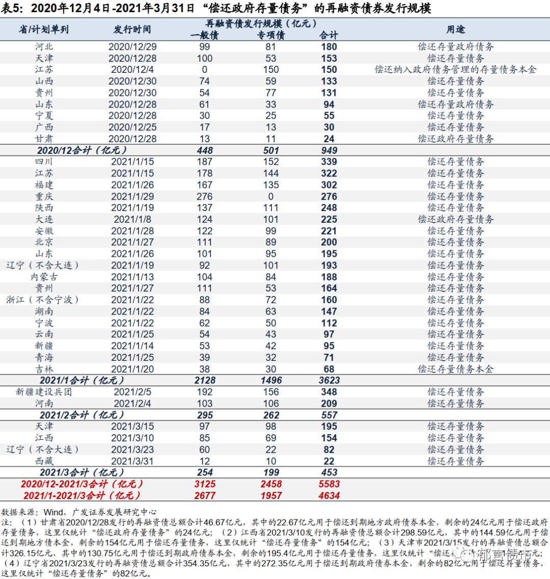 2021年一季度地方债发行再融资债8587亿元,新增地方一般债100亿元,新增地方专项债264亿元(据Wind)。再融资债中“偿还政府存量债务”的再融资债4634亿元。分月来看,1月、2月均未发行新增地方债,分别发行再融资债3623、557亿元,全部为“偿还政府存量债务”的再融资债;2021年3月发新增地方债364亿元,其中新增地方一般债100亿元(湖北),新增地方专项债264亿元(湖北150亿元+四川中小银行专项债114亿元)。3月发行再融资债4407亿元,其中“偿还政府存量债务”的再融资债453亿元。3月再融资债发行以常规再融资债(“偿还到期政府债券本金”)为主,特殊用途再融资债(“偿还政府存量债务”)发行集中在1月,2月。3月逐步减少。我们推测2020年12月以来特殊用途再融资债的发行可能接近尾声。