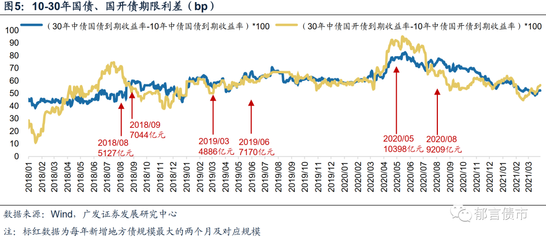 一个可供参考的例子是2020年30年-10年国债期限利差,因长期限地方债供给压力而走阔。具体来看,2020年发行地方债6.4万亿元,其中30年期地方债1.2万亿元,占比19%,而2019年发行4500亿元,占比10%,2018年仅发行20亿元。2020年5月22日,30年-10年国债期限利差达到83bp,国开债期限利差达到93bp,而2019年年末、2020年年初30-10年国债、国开债期限利差均处于60bp左右。供给冲击使得30年与10年的利差明显走扩。
