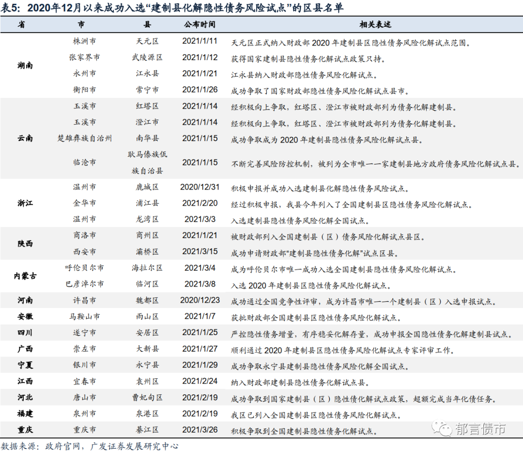 我们在《计划外“再融资债”,有何变化?》一文中提到,建制县隐性债务风险化解试点可以采用地方债置换隐性债务,2020年12月以来披露的建制县试点范围不断扩大。通过人工查找2020年财政预决算报告、政府工作报告,不完全统计出,自2020年12月以来,15个建制县纳入了隐性债务化解试点。湖南和云南均有4个,浙江有3个,陕西、内蒙古均有2个,河南、安徽、四川、广西、宁夏、江西、河北、福建、重庆各1个。