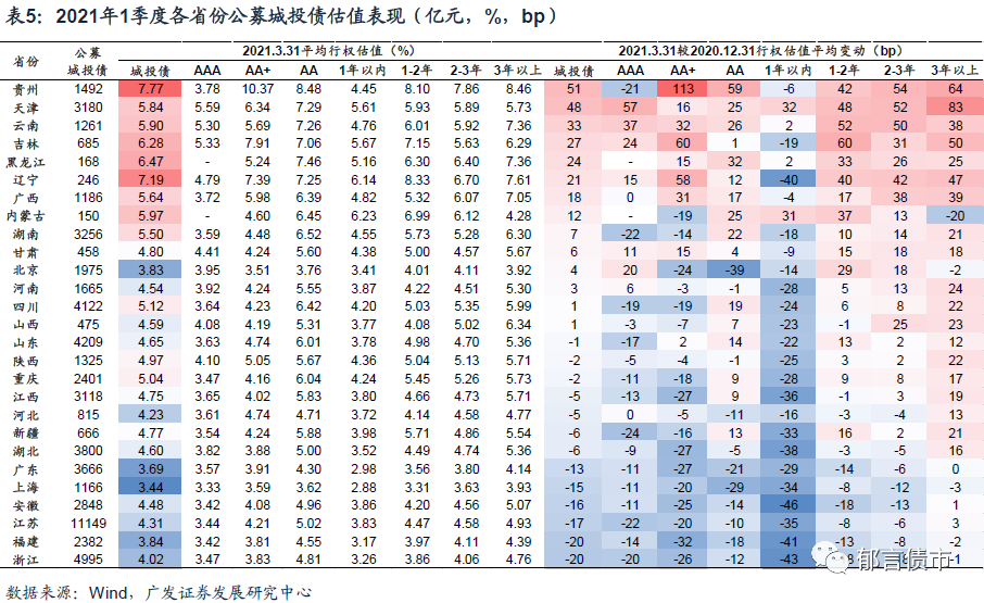 市场对城投债的风险偏好稍高一点,成交的范围有所扩大,从AAA评级扩展到AA+评级,不过期限还是1年以内的成交分布较多。从二级市场的估值变化也可以看出来,除了贵州、天津、云南和东三省,其余各省AAA和AA+评级,1年以内的收益率下行幅度大多在20bp以上,而AA评级及剩余期限的收益率均在上行。