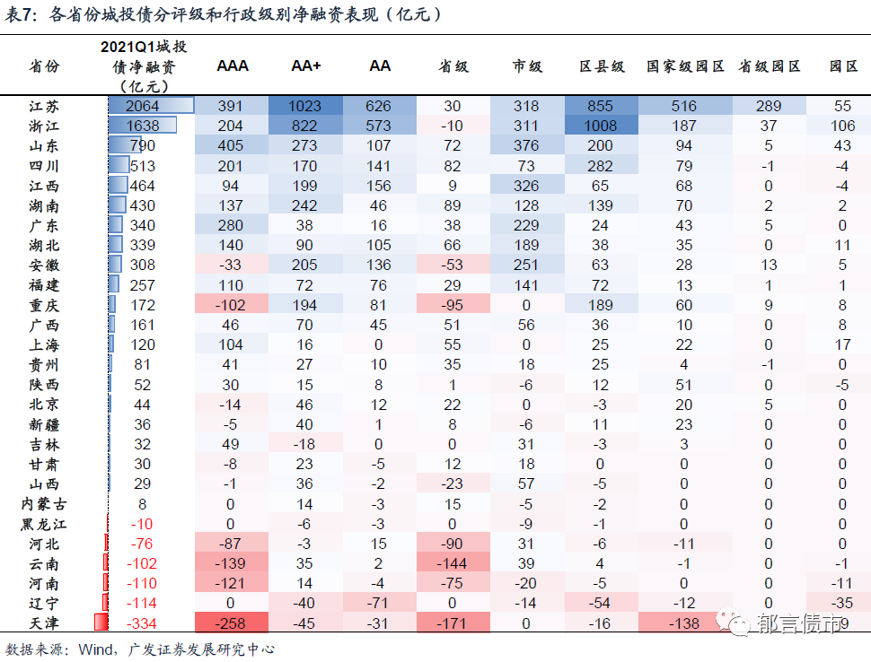 城投债,相对产业债的整体净融资为负,更多体现为各省份之间的分化。永煤事件之后,近三分之二的省份净融资规模小于去年同期,月度净融资为负的地级市在10个左右波动,天津、辽宁、河南、云南和黑龙江,净融资基本持续为负。而与之相对,广州、浙江、江苏、山东和四川的净融资,明显好于去年同期。并且从绝对融资规模来看,越来越向江苏和浙江抱团。而分等级和层级来看,AAA、AA+评级和市级平台更受青睐。