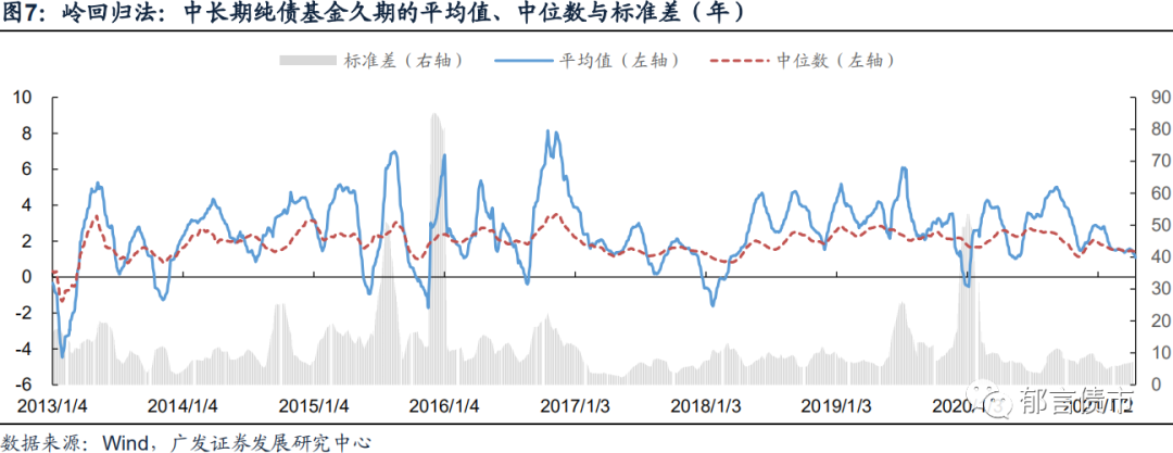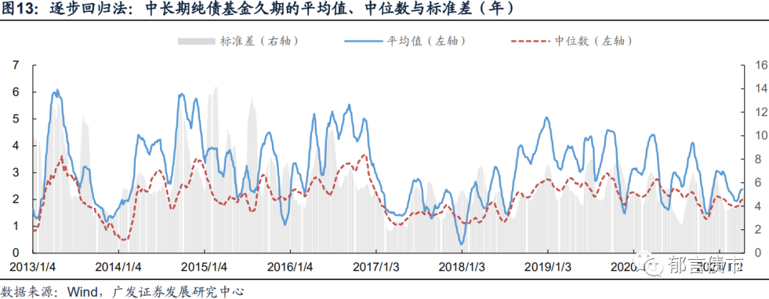 从逐步回归法计算的中长期纯债基金久期的整体平均值来看,结果较为稳健,无明显异常值,但是波动幅相对较大。