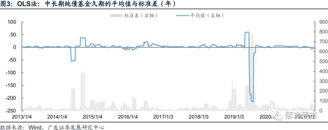 从OLS法计算的中长期纯债基金久期的整体平均值来看,结果并不是十分稳健,在经过数据平滑化处理后异常值依然明显,久期平均值的极值达到了-214,标准差同期极值也达到了776。