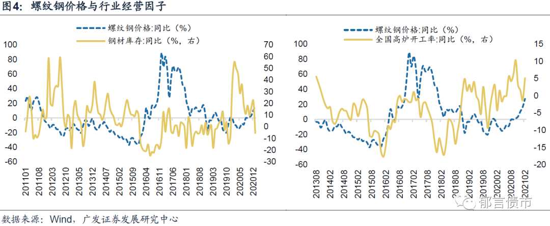 需求端的传导会影响到供给进而影响行业财务数据,如行业信用利差、钢铁企业亏损总额。钢铁行业作为周期性行业会经历周期性的盈利或亏损,行业财务数据,如信用利差,领先钢铁价格约3个月。整体看,螺纹钢价格和信用利差、钢铁企业亏损总额呈现显著负相关,并且相关系数均较大。说明钢铁行业亏损较严重或企业财务资质较差的时刻,往往预示钢铁价格反弹的到来。