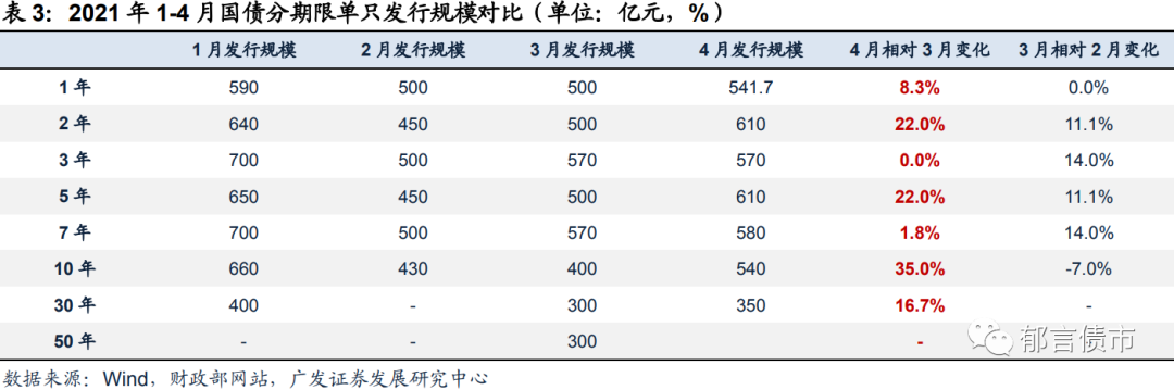 关注5月国债单只发行规模是否继续增加。4月附息国债单只发行规模,较3月多为增加,2年、5年和10年增幅在20%以上;但贴现国债规模从3月的单只200亿元降至150亿元左右。