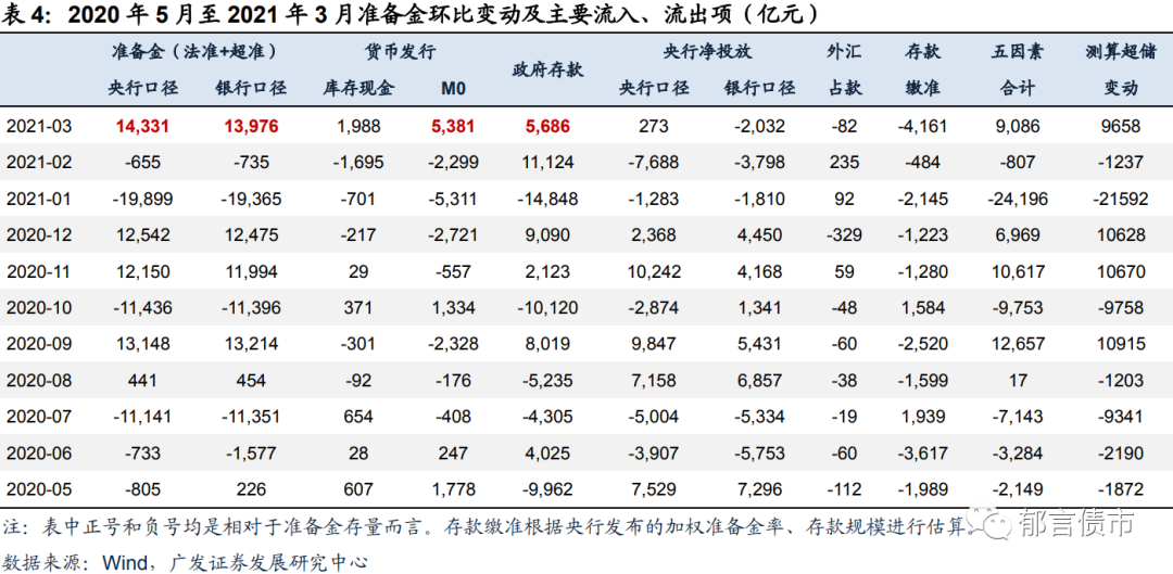 2021年3月末超储率估算约1.45%,较2021年2月末有所上升(方法详见《如何测算超储率?》)。从2021年3月影响超储的因素来看,相对于2月末,消耗超储的主要因素,是存款缴准消耗约4161亿元。补充超储的主要因素,是财政存款减少,对应补充超储5686亿元;节后M0回流补充超储约5381亿元。