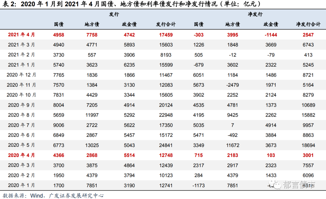 扣除到期看净发行,4月国债净发行-303亿元,地方债3995亿元,政金债-1144亿元,合计2547亿元。利率债净发行量低于3月,也低于2020年4月。利率债净发行量不高,一方面国债到期量较大;另一方面地方债发行进度较慢。