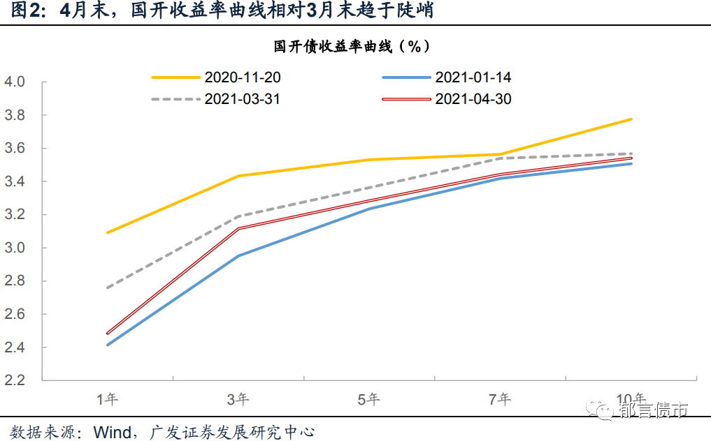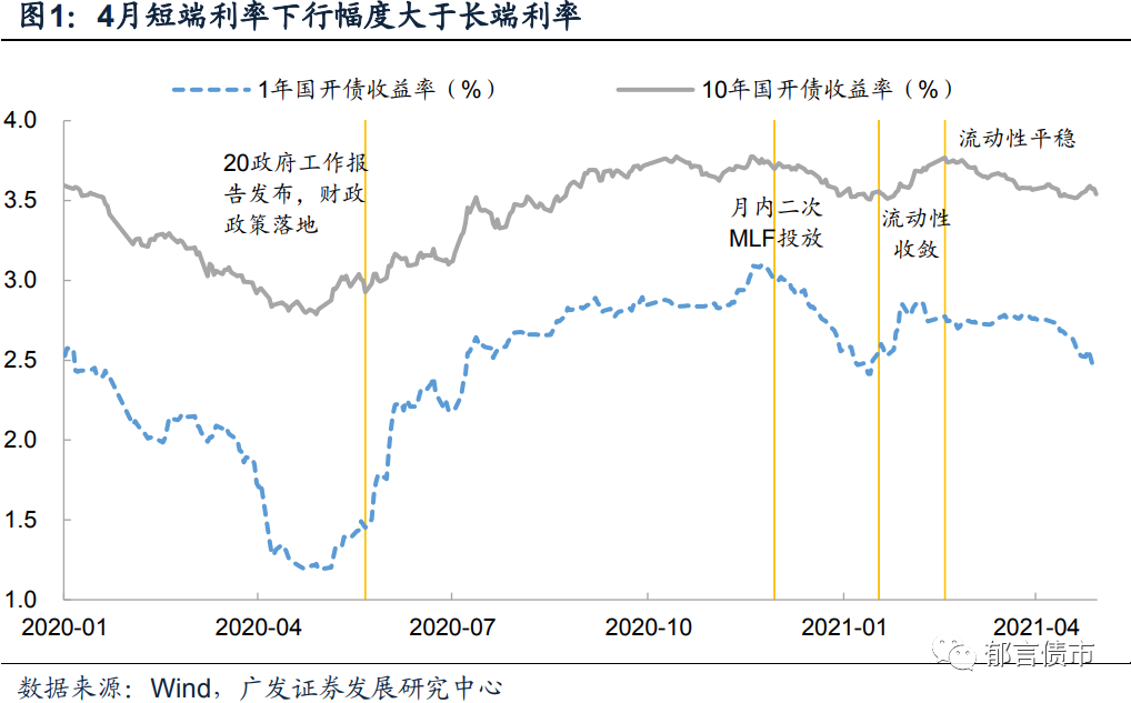 2021年4月短端利率出现明显下行,长端利率下行幅度小于短端利率。行情的触发因素主要源自三方面: