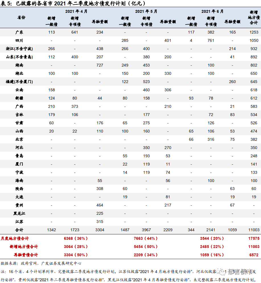 从计划发行来看,截至2021年5月11日,18个省、4个计划单列市披露了5月地方债发行计划,合计待发行7663亿元(新增地方债5454亿元、再融资债2209亿元)。