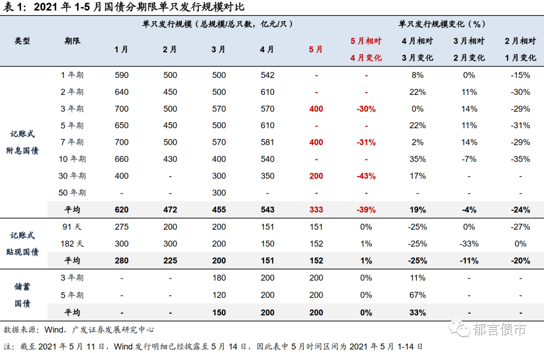 国债单只规模较4月约缩减三成