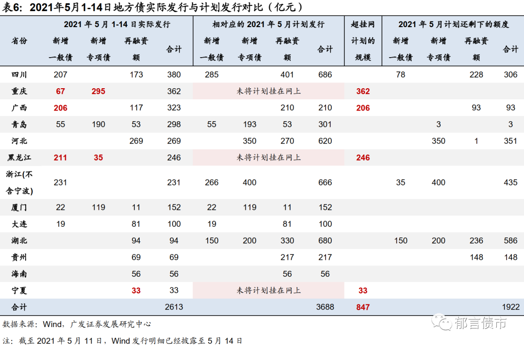 从实际发行来看,截至2021年5月11日,Wind地方债发行明细已经披露至5月14日,5月1-14日地方债发行规模为2613亿元。其中,按计划发行1766亿元(新增地方债843亿元、再融资922亿元),已披露计划之外的发行规模为847亿元(新增地方债814亿元、再融资债33亿元)。