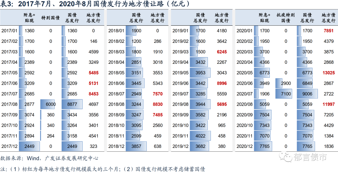 回顾历史,2017年7月、2018年7月、2020年8月均出现国债发行缩量,为地方债发行让路的情况。