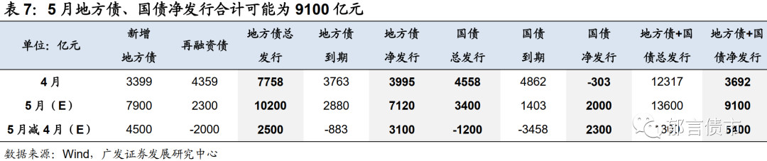 考虑国债,5月地方债和国债可能合计发行13600亿元(较4月约增加1300亿元),净发行9100亿元(较4月约增加5400亿元)。净发行增加较多主要与5月地方债、国债到期均减少有关。其中地方债5月到期2880亿元(较4月减少883亿元),国债5月到期1403亿元(较4月减少3458亿元)。