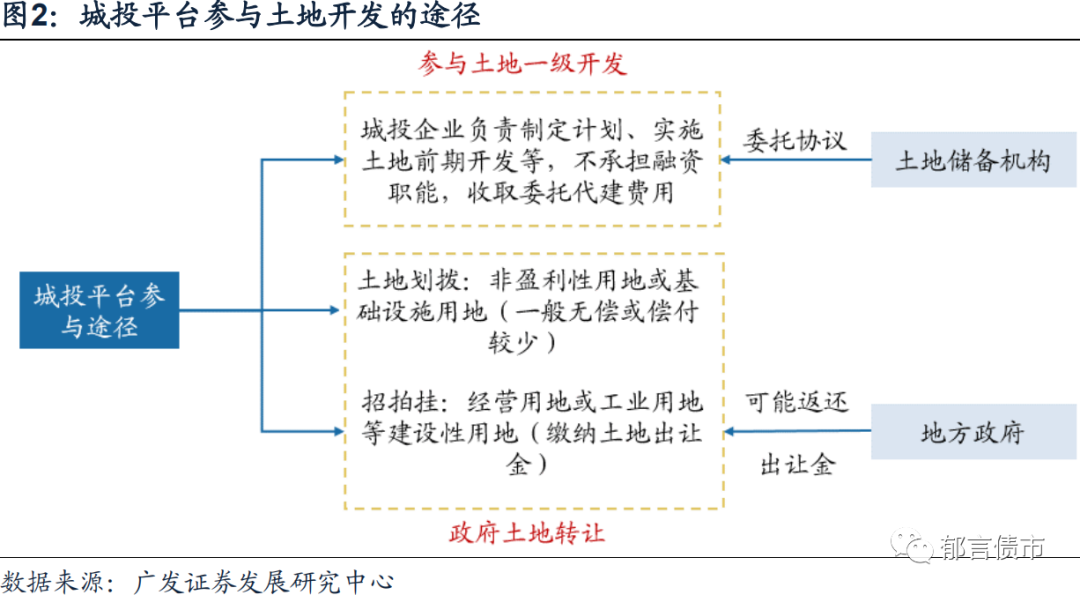 从土地储备制度和相关政策要求来看,城投平台可以通过参与储存环节或供地环节以进行土地开发业务,具体有如下三种方式: