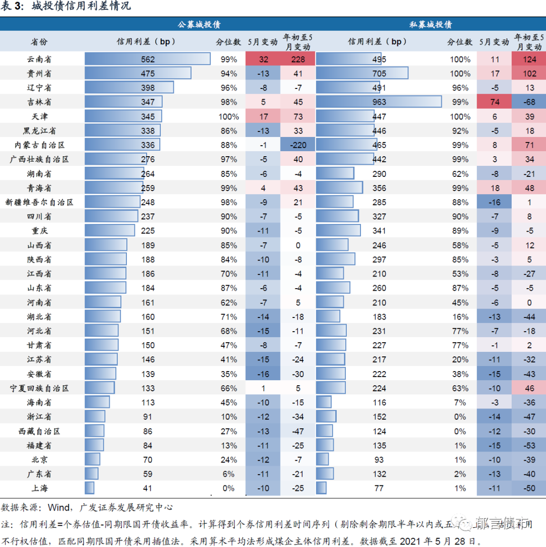城投主体利差除部分弱资质地区外普遍压窄。2021年5月,31省城投公募债信用利差多数收窄,仅有5个省份出现走扩,包括云南、吉林、天津、青海、宁夏等,利差走扩的主体集中在一些尾部弱资质区域。