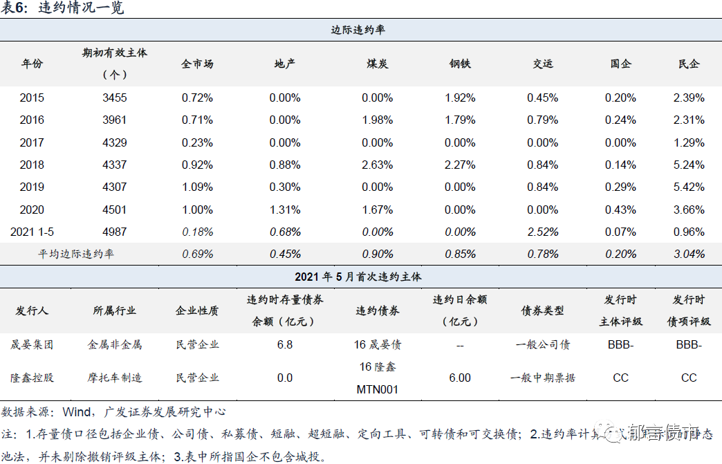 2021年5月,共新增晟晏集团、隆鑫控股两家违约主体,2021年1-5月共9家违约主体,以新增违约主体/期初主体数计算的边际违约率来看,2021年1-5月仅0.18%,低于2019-2020年同期水平。