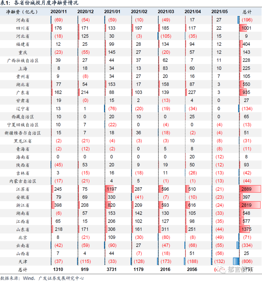 天津、云南、江苏、山东、浙江等省份净融资缩量明显。2021年5月,城投净融资较上月下降2477亿元至-421亿元。其中,天津和云南的债券净融资在永煤事件之后一直为负,没有明显恢复。而江苏、山东、浙江等净融资本来大幅为正,5月转负,可能受到了城投发债红黄绿分档的限制。我们在《从城投发债用途看区县红黄绿分档》报告中对城投发债用途进行了系统整理,可以看出大部分省份城投发债用途都更多用于借新还旧。