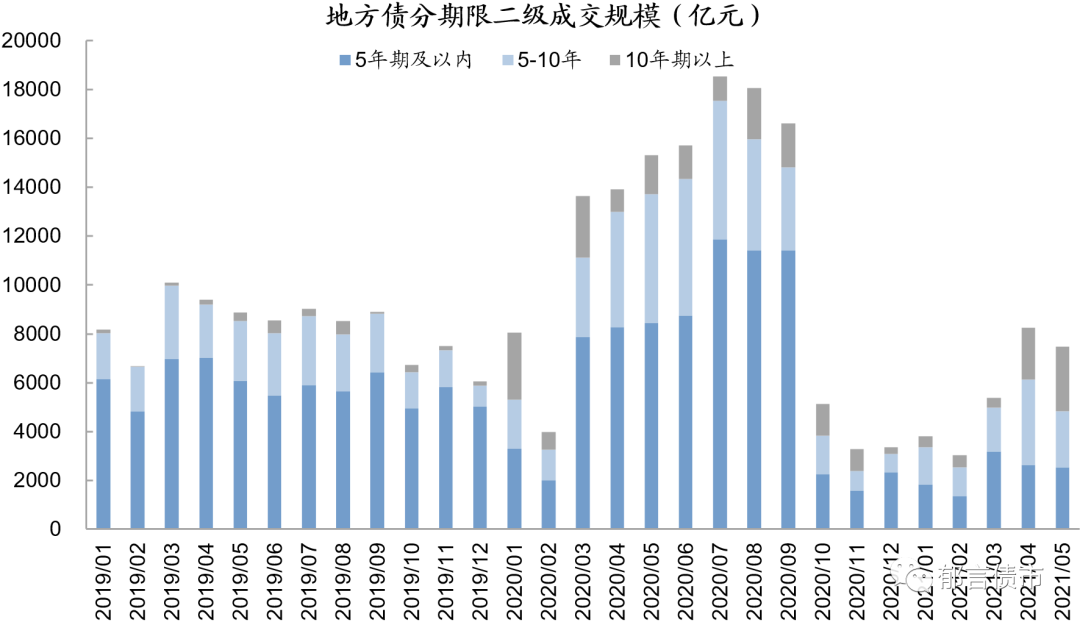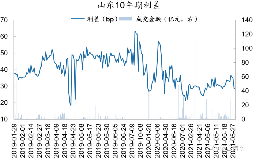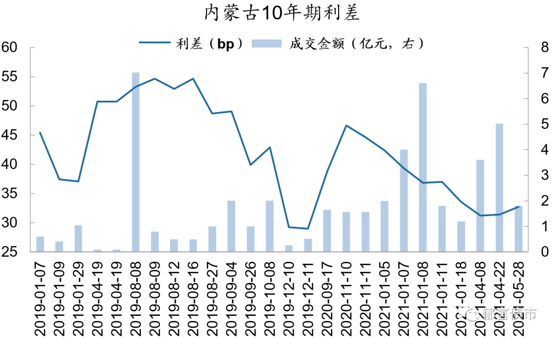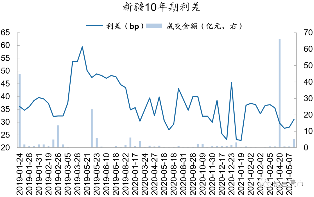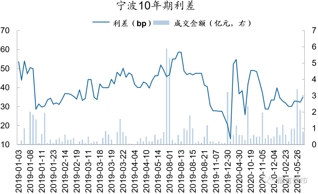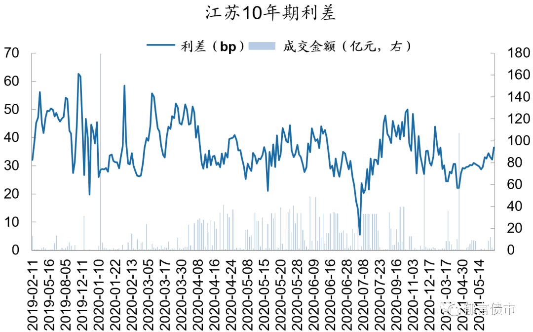 注:数据来源于Wind[债券区间日行情]板块,按日下载后处理。Wind的成交来源有四个,分别为中国外汇交易中心、上海证券交易所固定收益平台、交易所(包括上交所和深交所),货币中介。其中来源货币中介的成交记录无成交量指标,其他三个渠道有成交量以及加权YTM数据。我们在计算利差时,没有计算来源货币中介的数据(2019年1月-2021年5月来源货币中介的成交条数占Wind四个渠道的11%)。