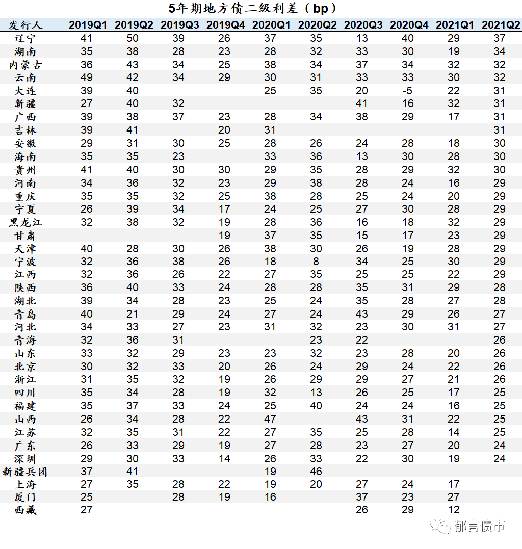 二级利差=(地方债到期收益率-同一日同期限国债收益率)*100,全文相同