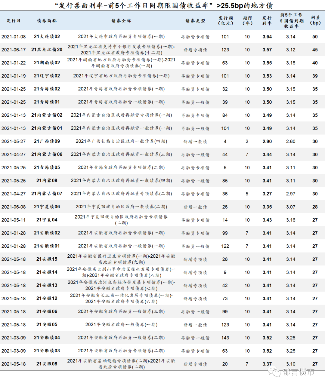 2021年1月-6月23日合计发行633只地方债,其中584只一级发行利差 [(发行票面利率-前5个工作日同期限国债收益率)*100] 位于24.5到25.5bp之间。