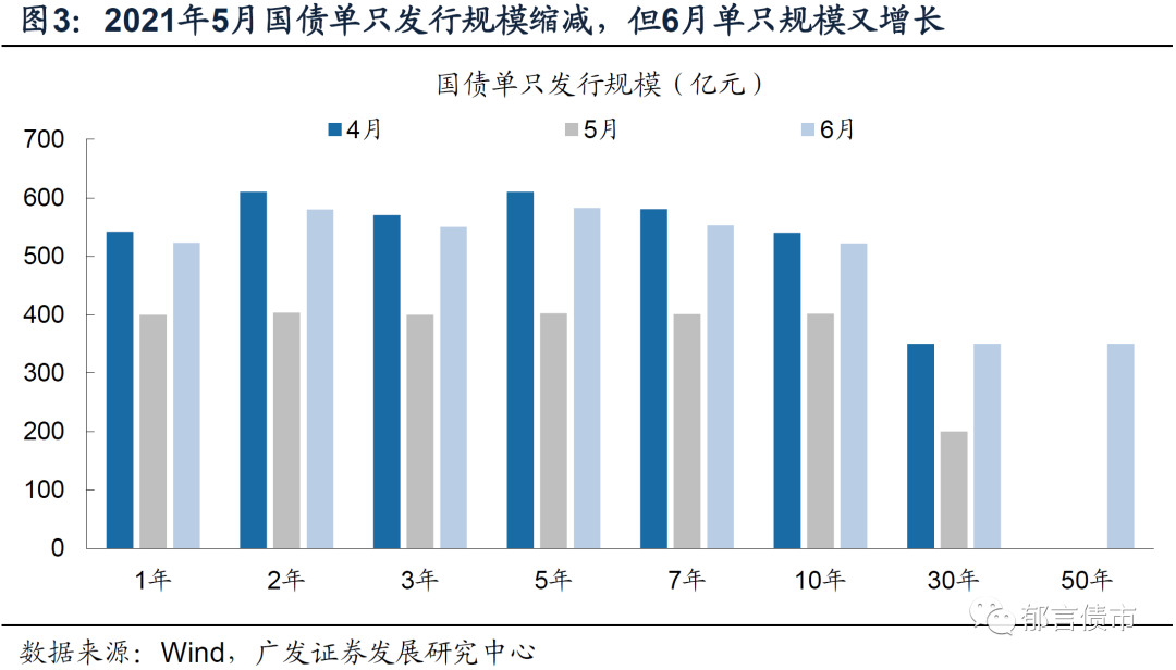 6月国债单只发行规模较5月有所增长。5月国债单只发行规模,相对4月同期限发行规模明显缩减,6月单只发行规模又较5月有所增长。从国债总发行规模来看,6月发行5064亿元,较5月增加1298亿元。但由于6月国债到期规模相对较大,从国债净发行规模来看,6月净发行2635亿元,较5月仅小幅增长572亿元。