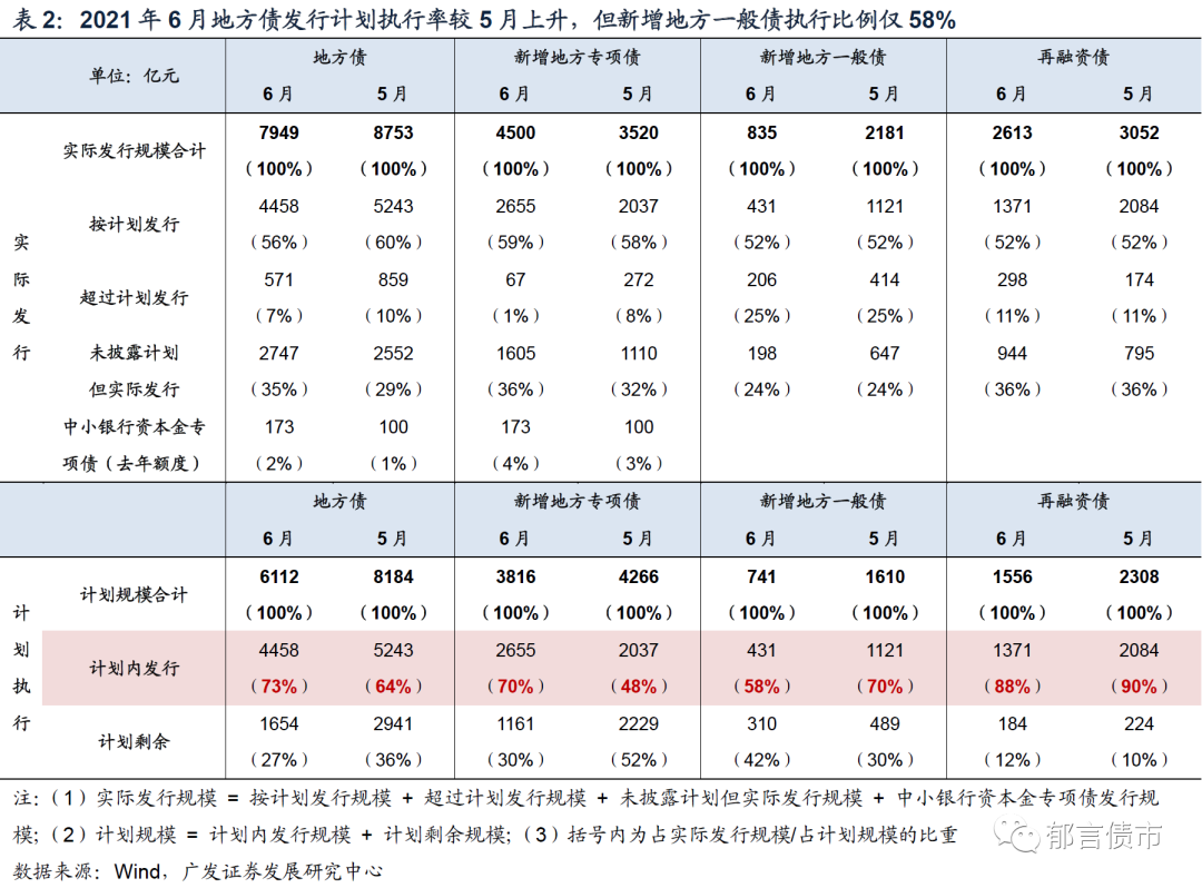 6月新增一般债按计划发行比例则低于5月,仅达到58%,执行比例较低。具体表现为,6月新增地方一般债计划741亿元,按计划实际发行431亿元,占比58%,而5月这一比例为70%。再融资债按计划发行比例连续2月均较高,也就是说,计划安排的再融资债基本都可以发出。具体表现为,6月计划再融资债1556亿元,按计划实际发行1371亿元,占比88%,而5月这一比例为90%。