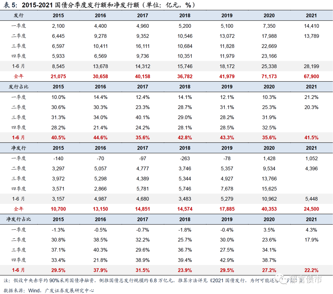 节奏上,1-6月国债发行进度基本与历史相当。参考2020年各月国债净发行规模,预计国债净发行高峰出现在四季度。从7月单月来看,7月国债到期较大,净发行有可能为负。