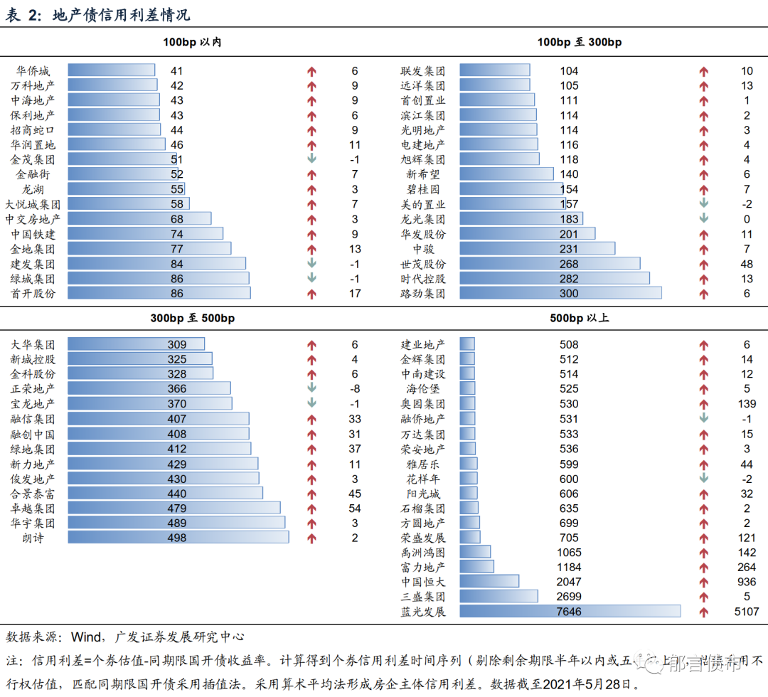 地产主体利差普遍走扩。2021年6月,65家TOP100地产发债主体信用利差中56家走扩,9家收窄,中低估值主体利差走扩幅度较大。其中,利差在100bp内的主体,除华润置地、建发集团、绿城集团外,6月以来利差全体走扩。高估值主体当中,蓝光发展、中国恒大、富力地产、禹州鸿图、荣盛发展利差走扩均超过100bp。