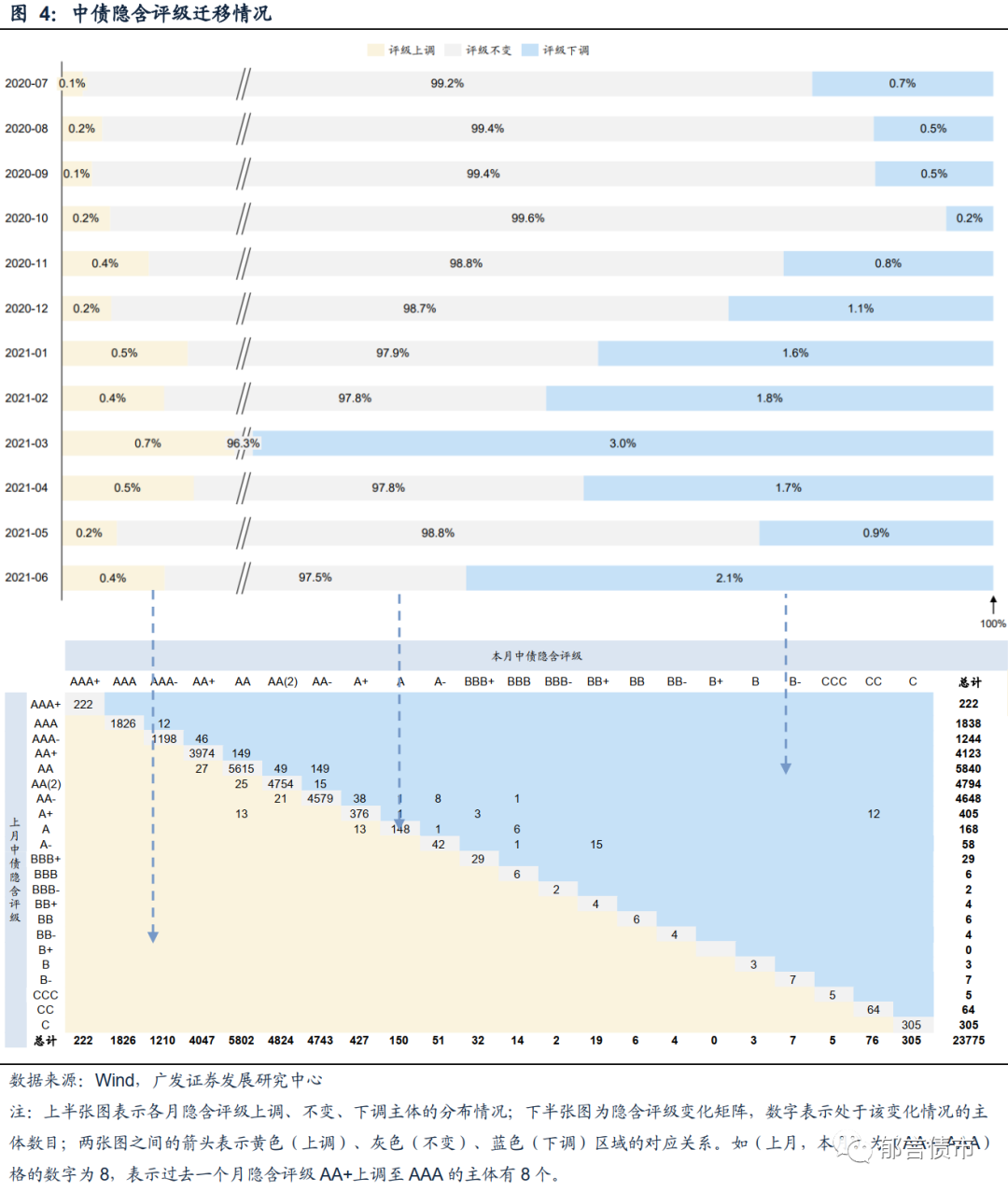隐含评级自2021年3月以来再次加速“信用分层”趋势。2021年6月,中债隐含评级下调比例为2.1%,上调比例为0.4%,较上月分别上升1.2和0.2个百分点。既4-5月“信用分层”阶段性放缓后,6月隐含评级再度出现“两极分化”特征。