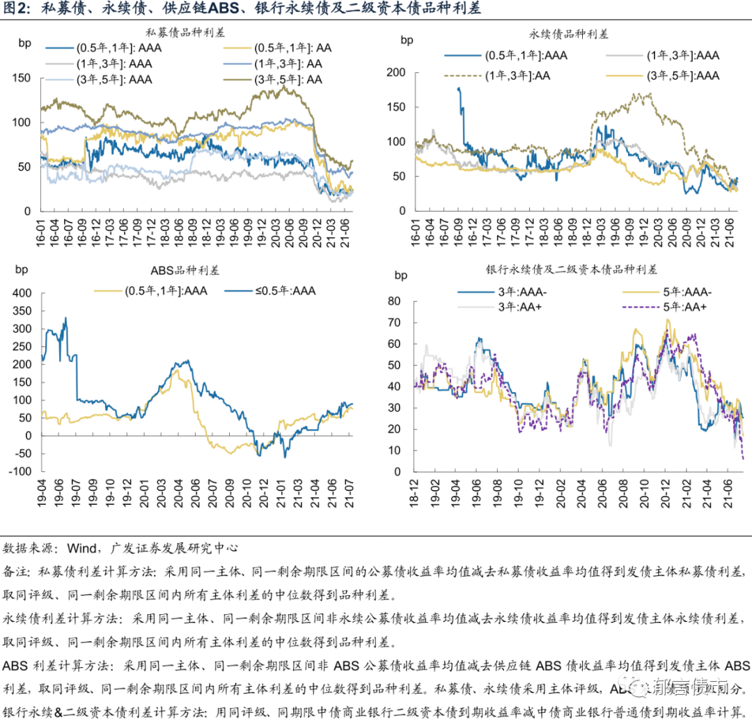 防风险思维主导下,银行资本债成为信用债拉长久期的首选。7月市场的一大特征是品种利差继续被压缩,尤其是长久期的品种利差。压缩幅度最大的是银行资本债,5YAAA-银行资本债(五大行)利差压缩11bp,5YAA+银行资本债(股份行)利差压缩19bp。其他品种来看,长久期(3-5Y)AAA企业永续债利差压缩8bp,长久期AAA私募债品种利差较6月底基本持平。而久期偏短的品种利差,并无明显压缩迹象,再次验证久期是7月市场分化的关键。从成交热度来看,7月企业永续债与银行永续债周度换手率也在不断上升。