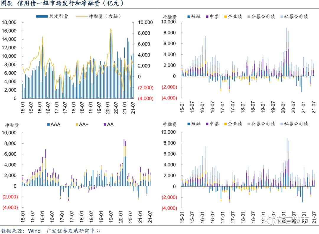 7月净融资额下行,城投有所下降但仍为正。7月信用债总发行10671.9亿元,到期8302.3亿元,净融资2369.6亿元,环比下降738.7亿元。